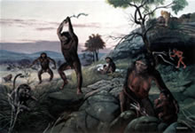 Australopithecus: que significa macaco do sul, ele media até 115 centímetros de altura, andavam na posição vertical, e usavam como armas ou como instrumentos paus e pedras, não usavam a palavra como forma de comunicação, mais 2,5 milhões de anos começaram a caçar carne, pois para digerir, seria para eles bem melhor, sendo que a partir daí seu sistema fisiológico, fazendo com que seu estômago diminuísse.